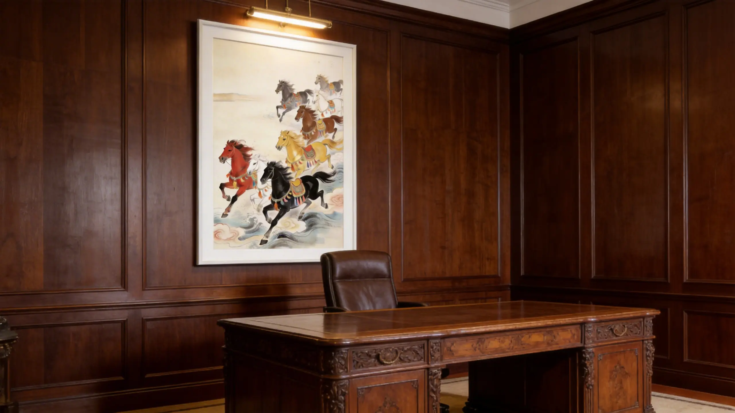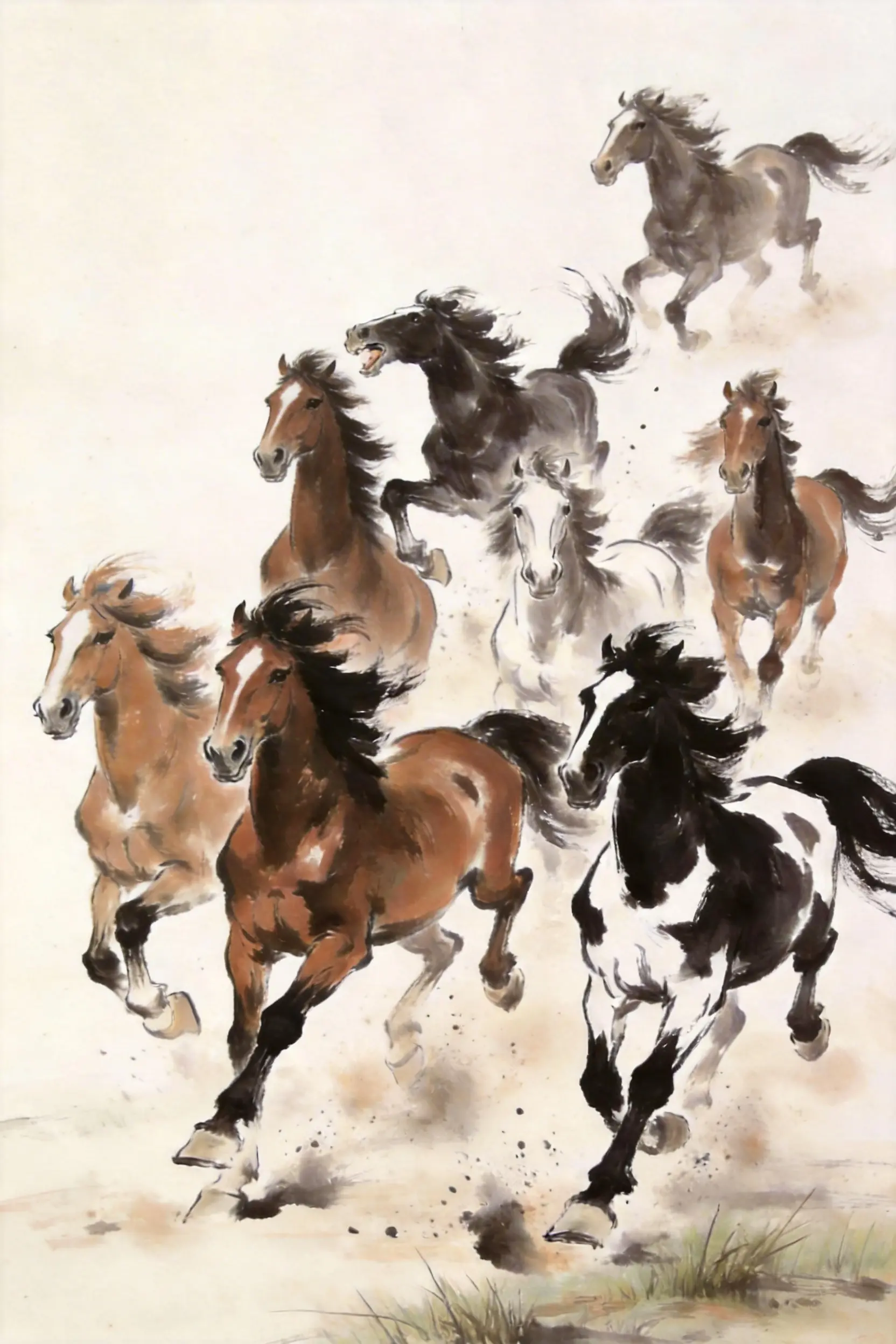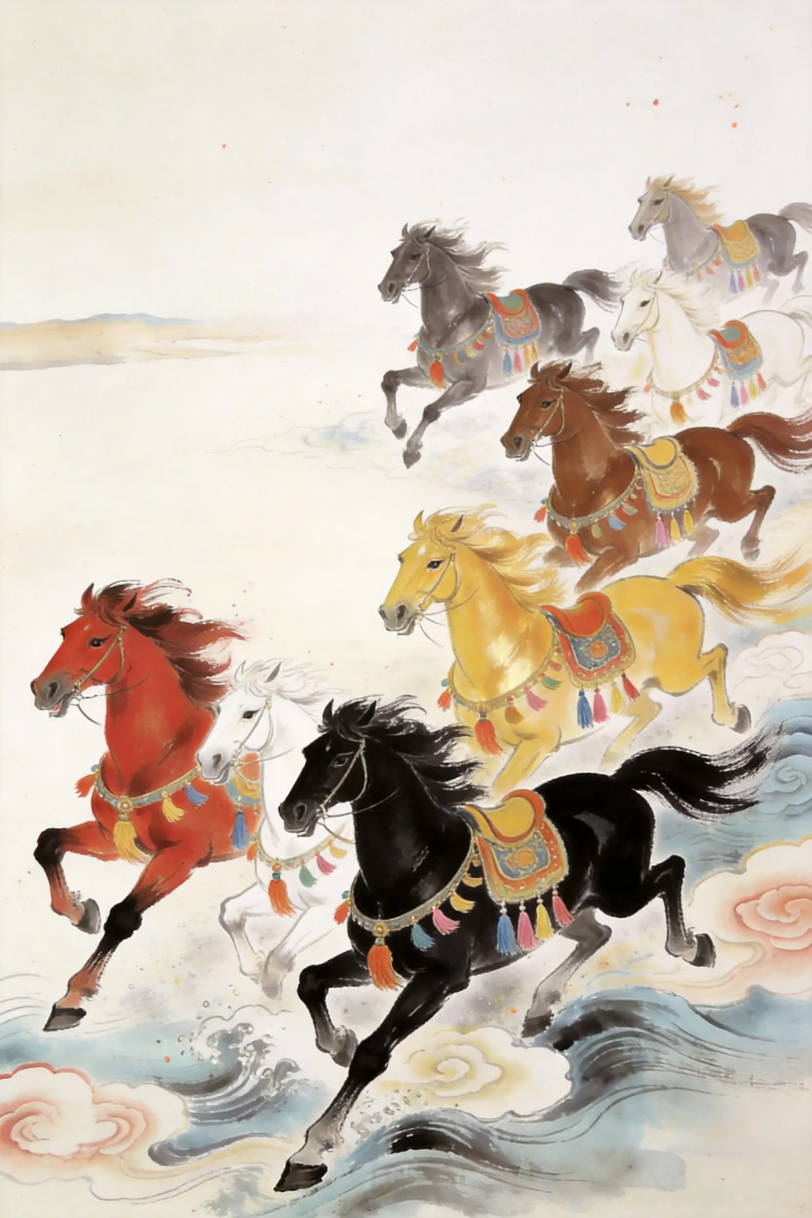 Horses represent speed, power, and perseverance. The Eight Galloping Horses symbolize rapid success and the ability to overcome obstacles effortlessly (Ma Dao Cheng Gong). This dynamic artwork energizes a space, boosting motivation and helping the owner achieve their goals quickly. Ideally placed in a workspace or living room.
