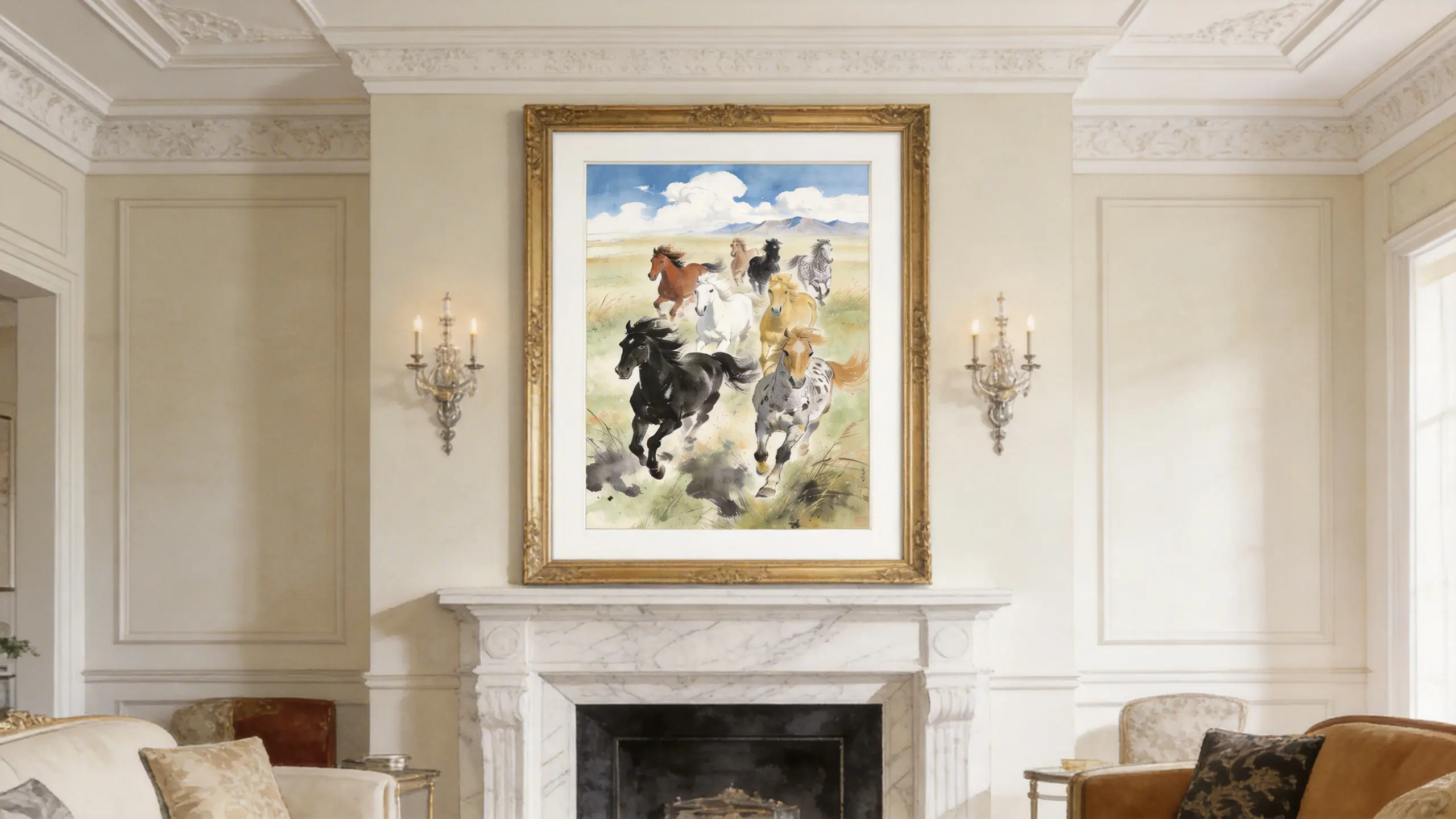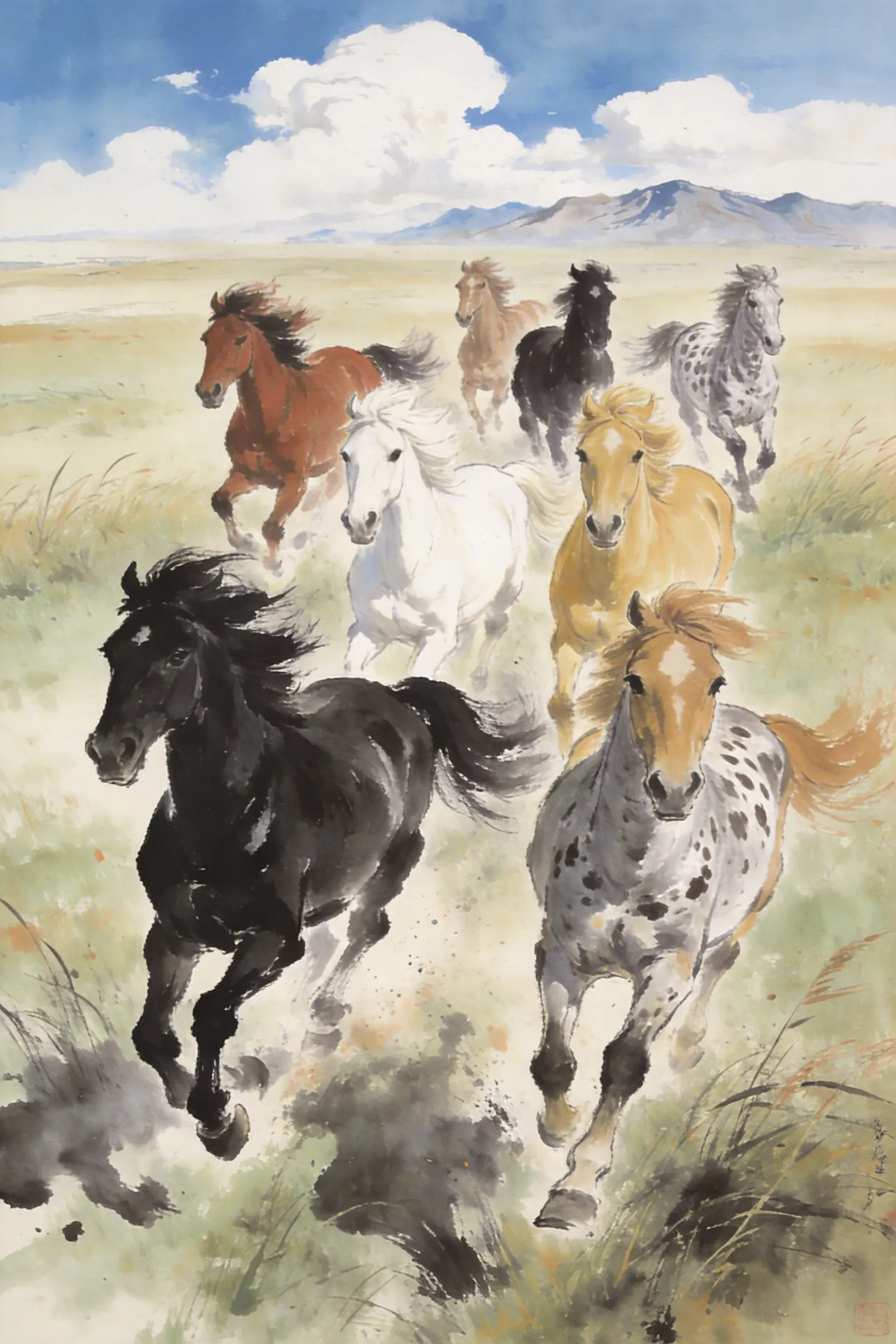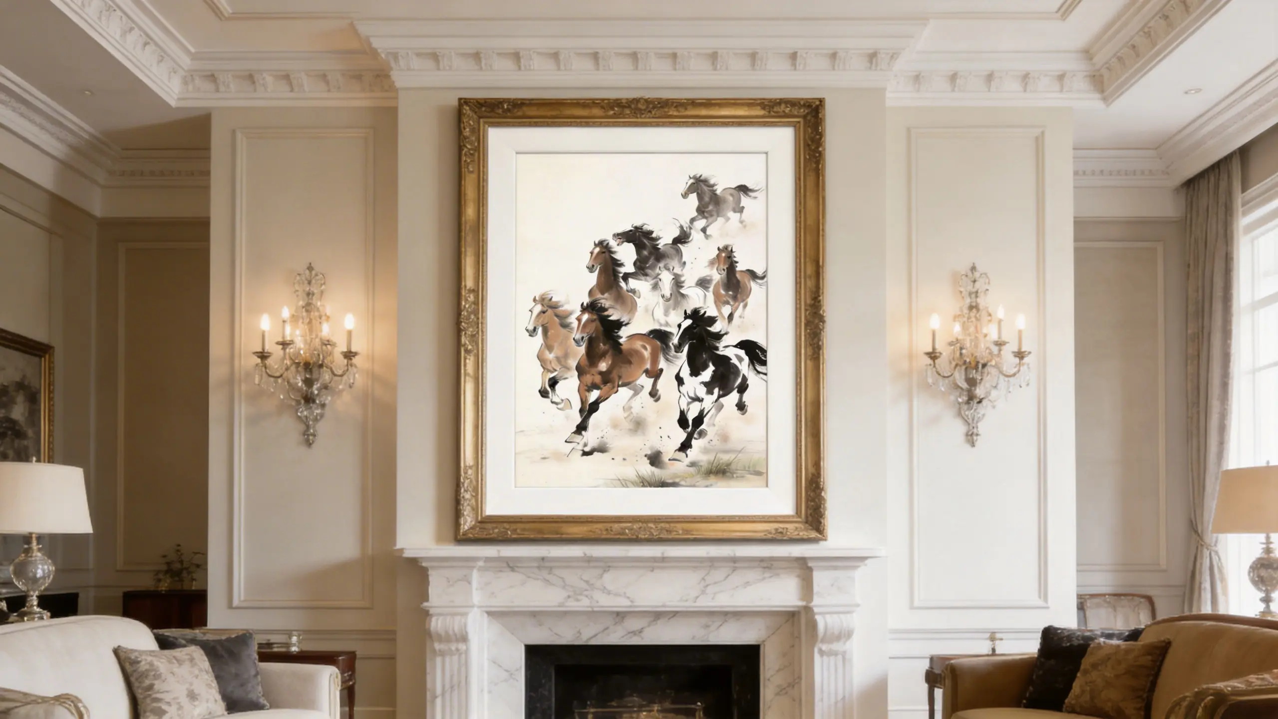 Horses represent speed, power, and perseverance. The Eight Galloping Horses symbolize rapid success and the ability to overcome obstacles effortlessly (Ma Dao Cheng Gong). This dynamic artwork energizes a space, boosting motivation and helping the owner achieve their goals quickly. Ideally placed in a workspace or living room.
