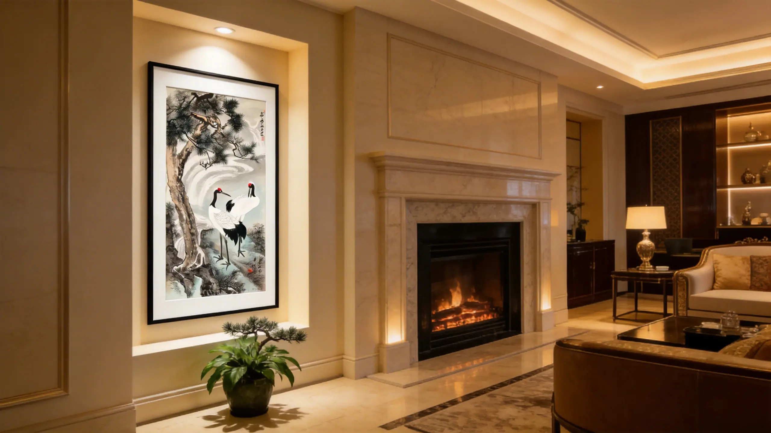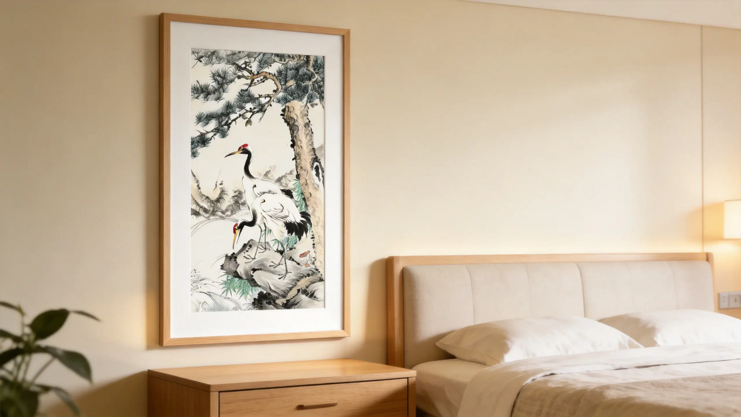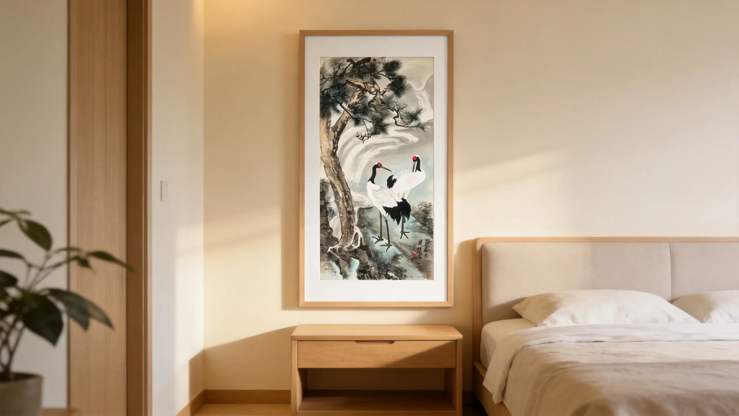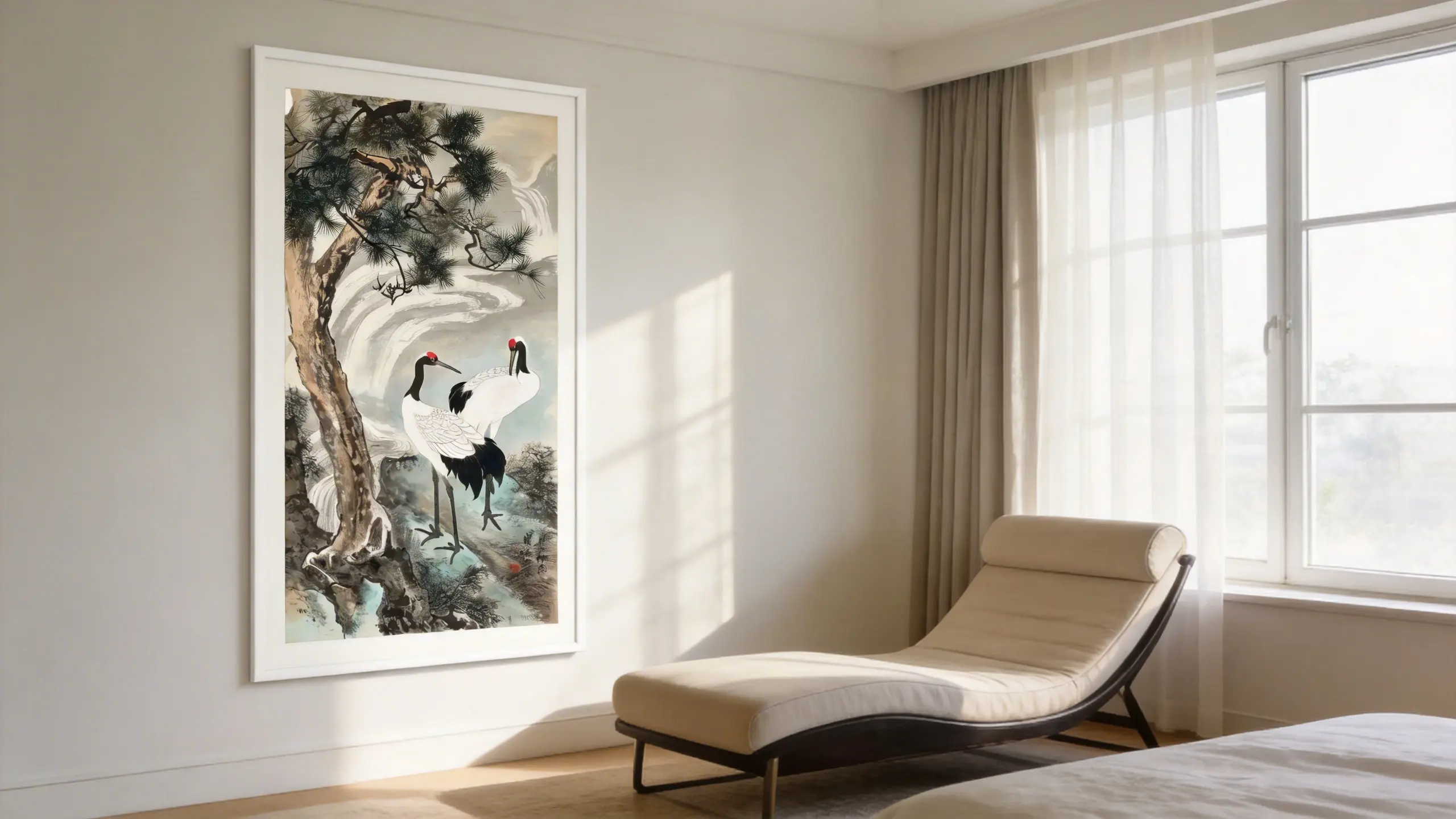 This composition is often titled “Pine and Crane Prolonging Life.” The Pine tree, an evergreen, symbolizes steadfastness and endurance, while the Red-Crowned Crane is a legendary bird of longevity and wisdom. Together, they create a powerful Feng Shui cure for health and long life. It is ideal for households with elderly family members to promote vitality and harmony.