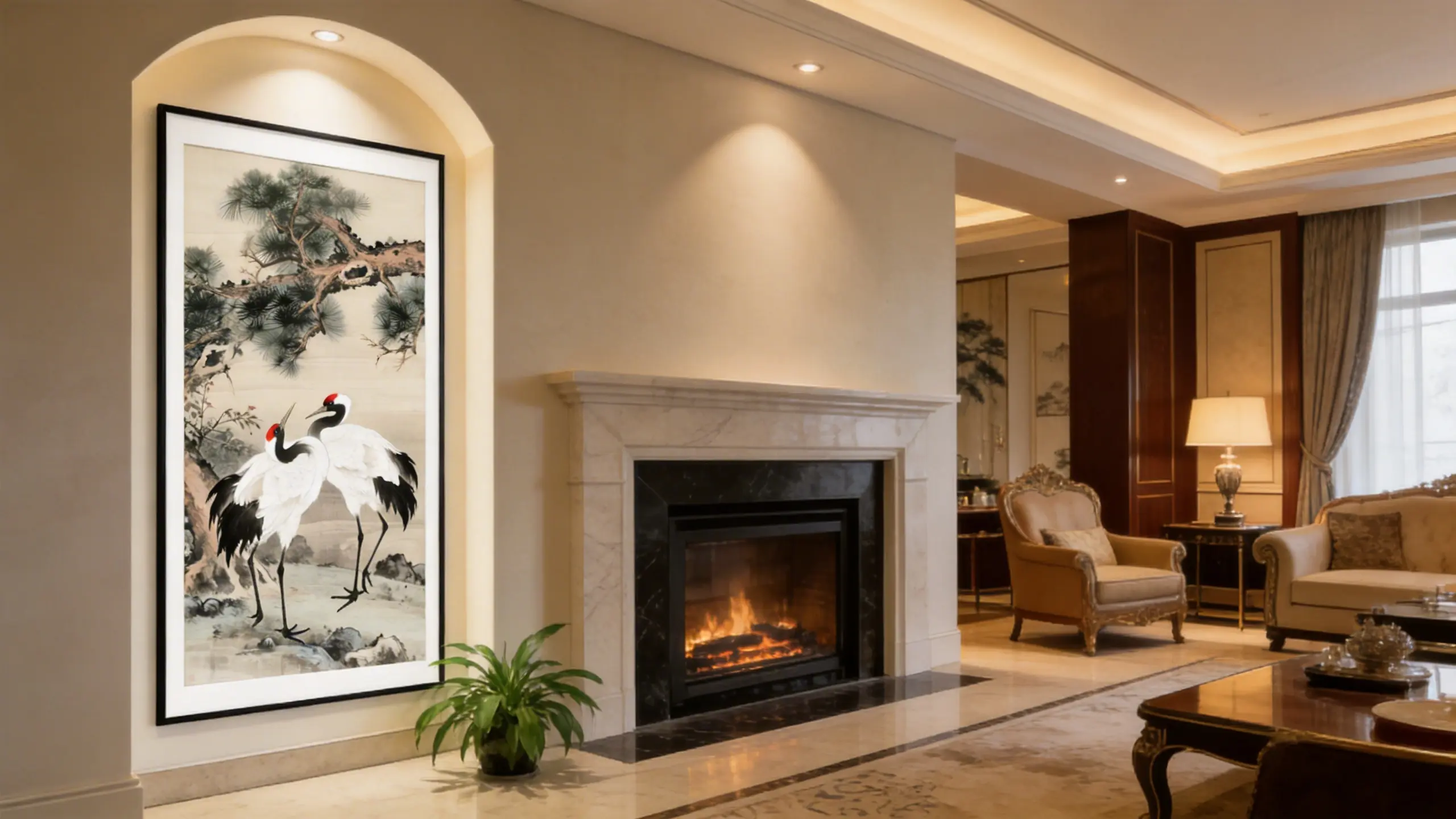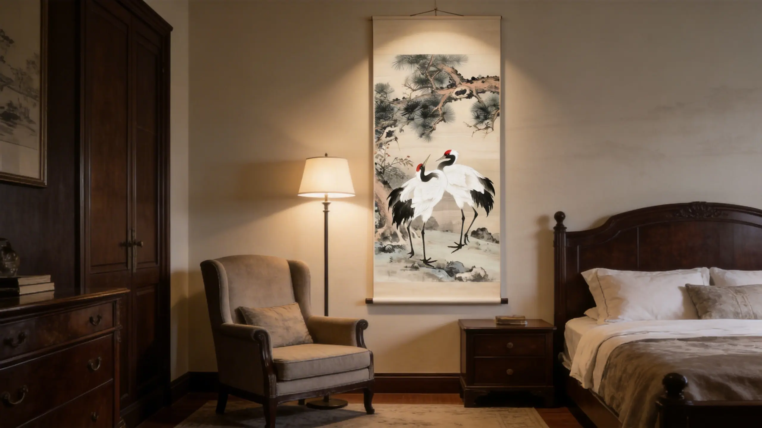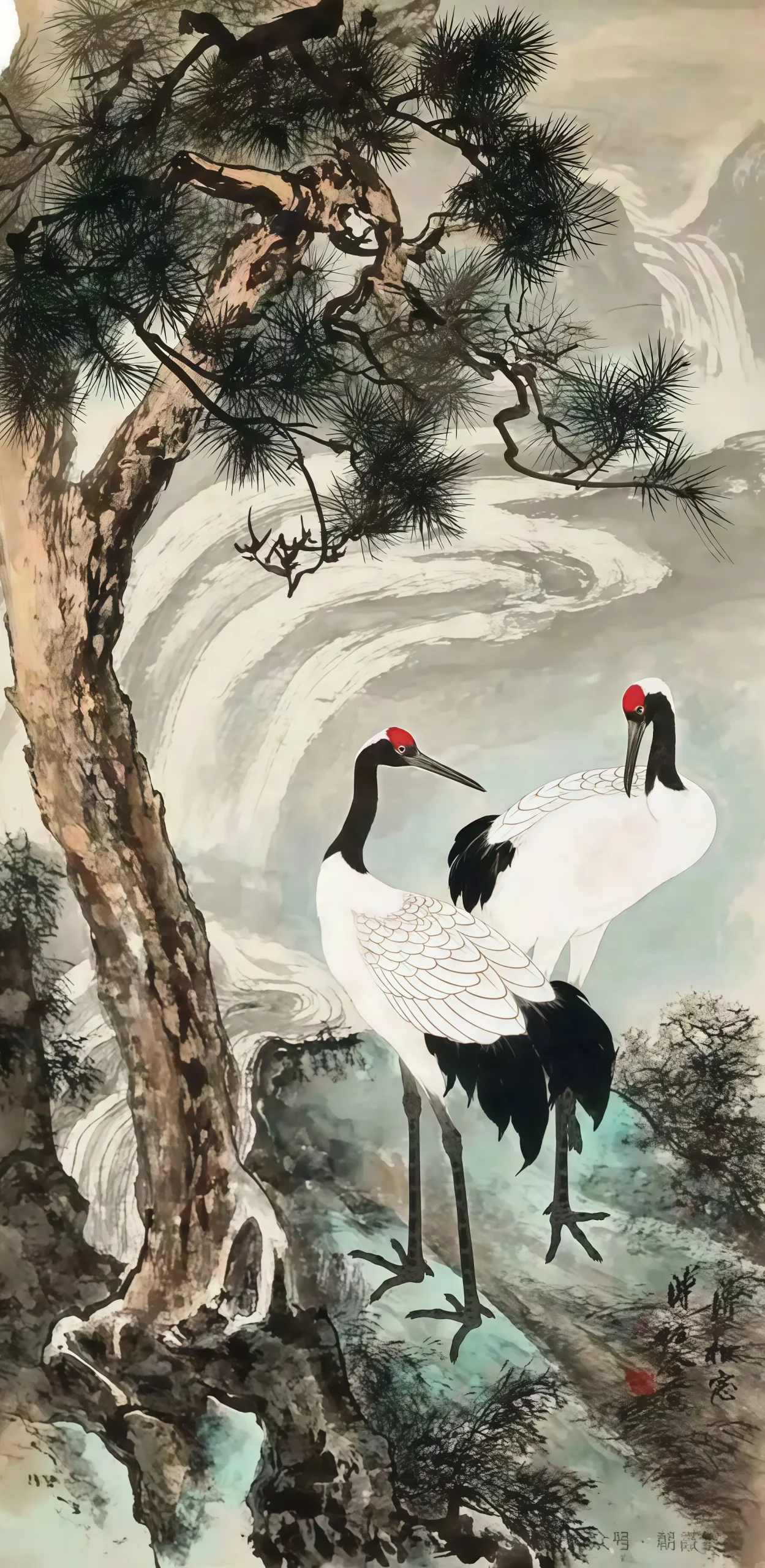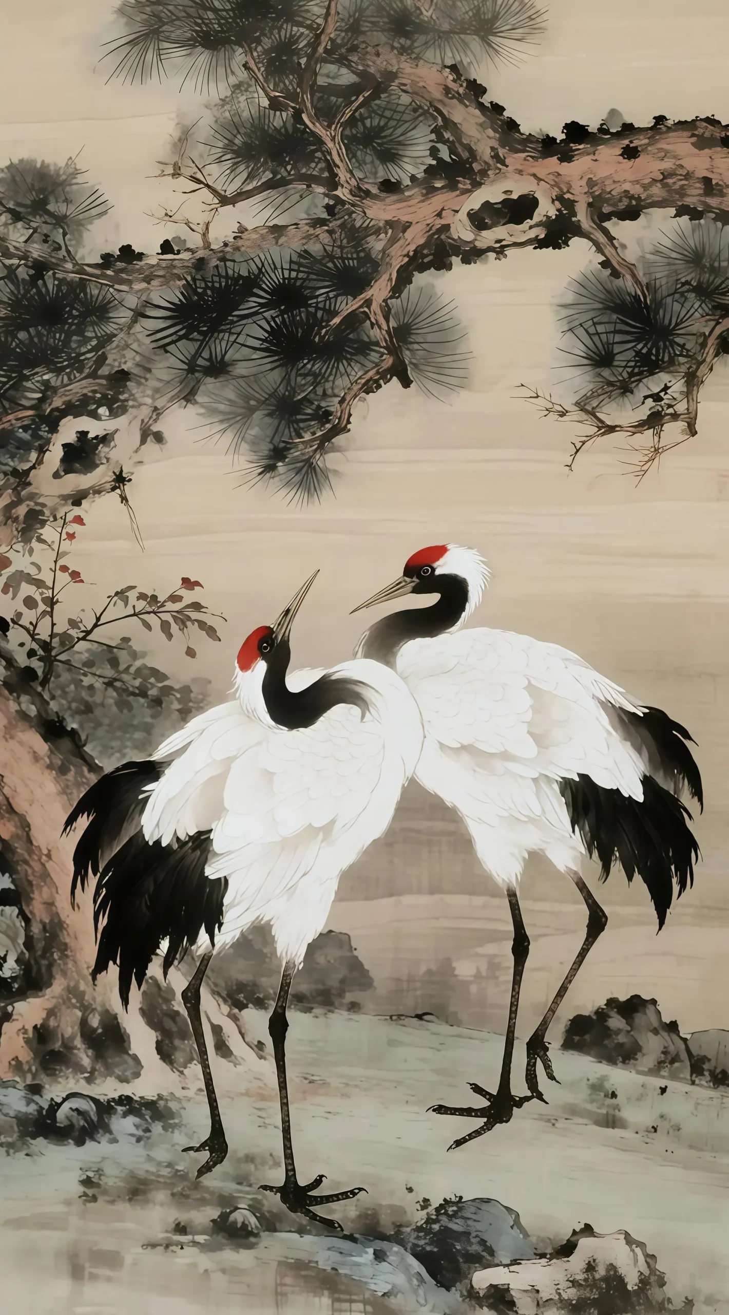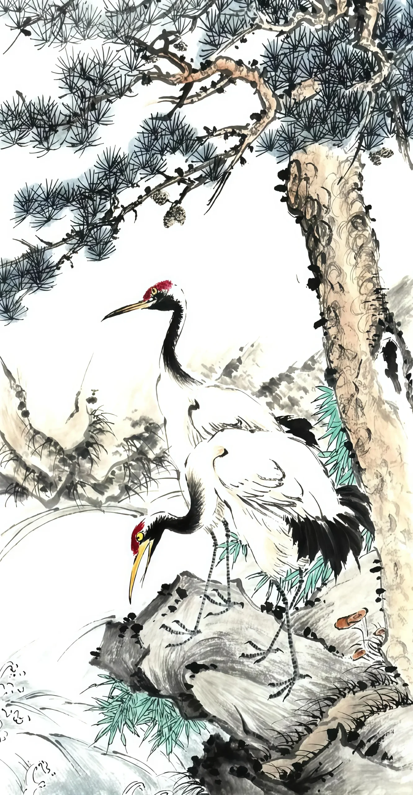 This composition is often titled “Pine and Crane Prolonging Life.” The Pine tree, an evergreen, symbolizes steadfastness and endurance, while the Red-Crowned Crane is a legendary bird of longevity and wisdom. Together, they create a powerful Feng Shui cure for health and long life. It is ideal for households with elderly family members to promote vitality and harmony.