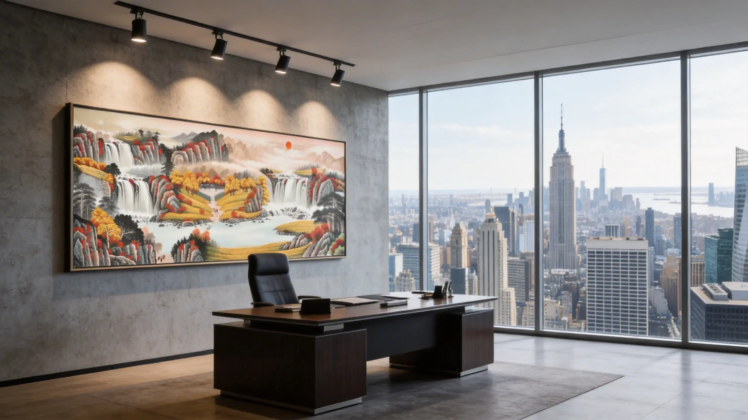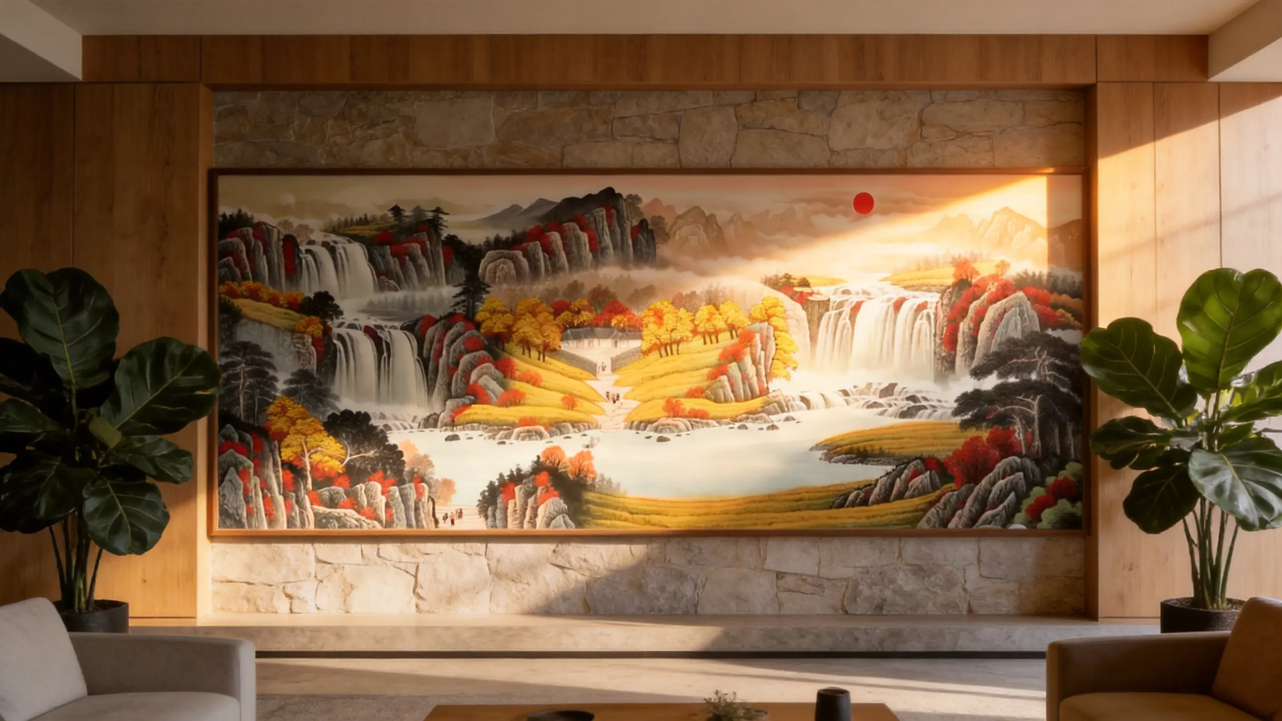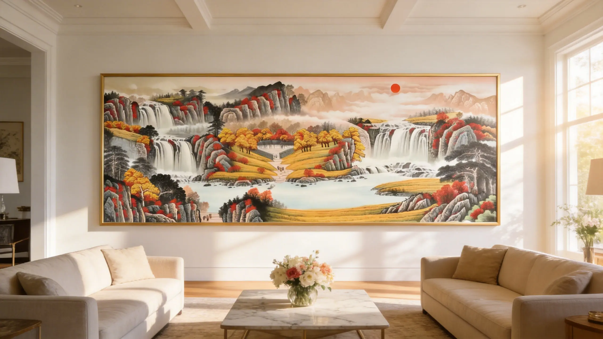 In Feng Shui, the East represents the “Wood Element,” symbolizing growth, family health, and ambition. This masterpiece, “Xu Ri Dong Sheng” (The Rising Sun), is specifically composed to activate this sector.