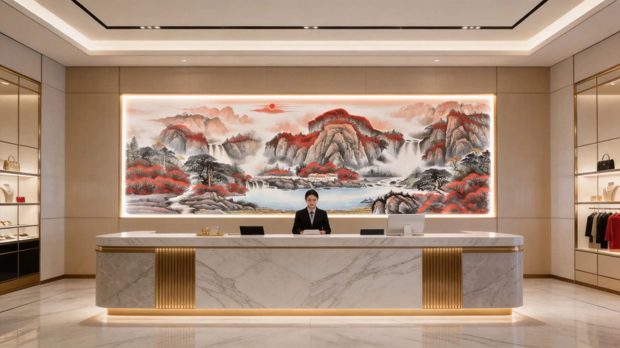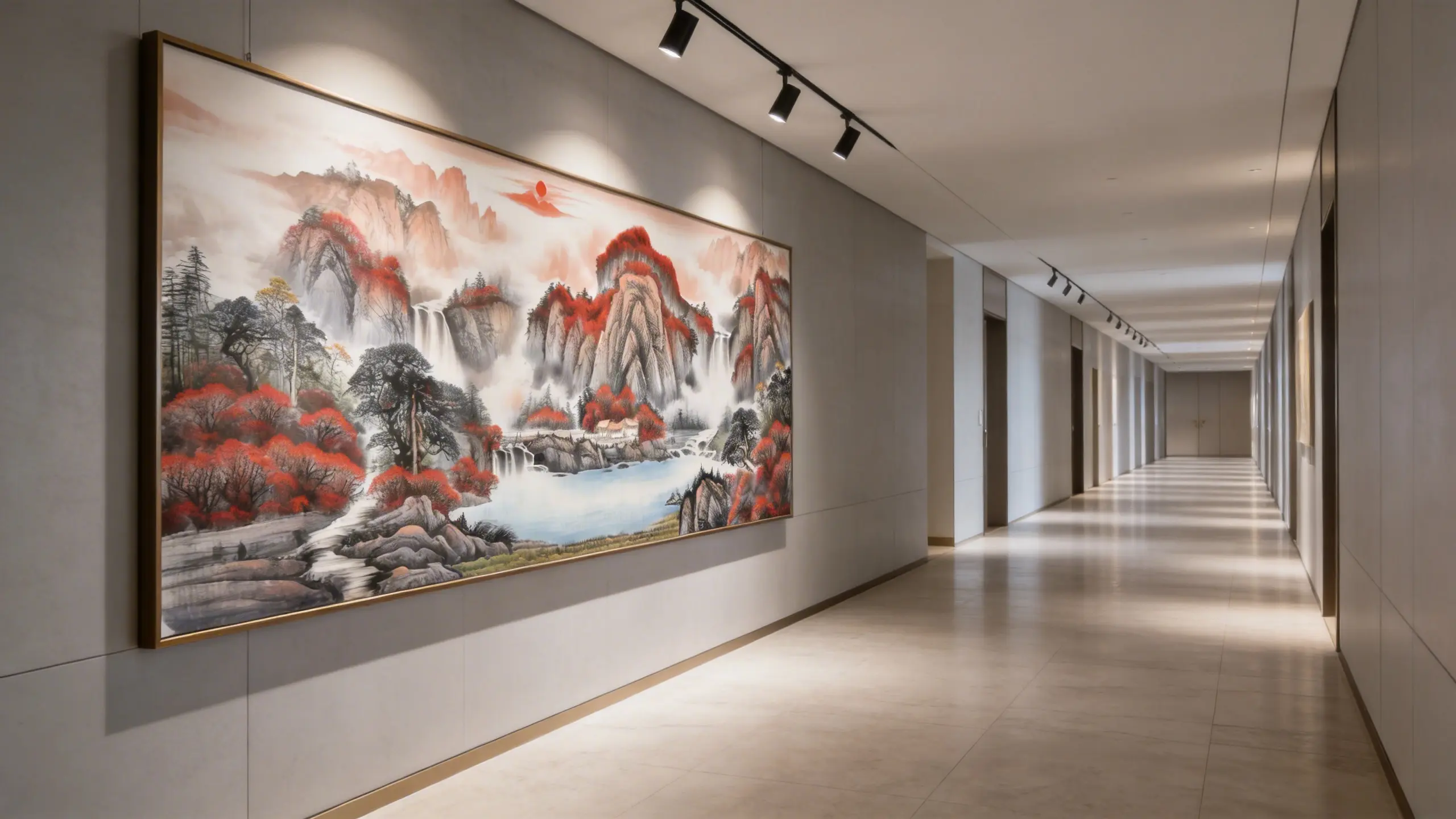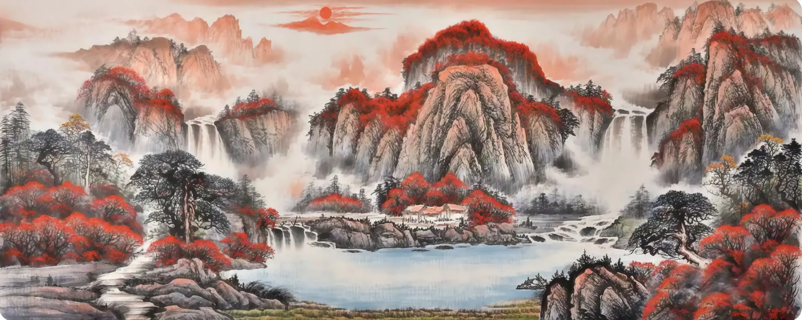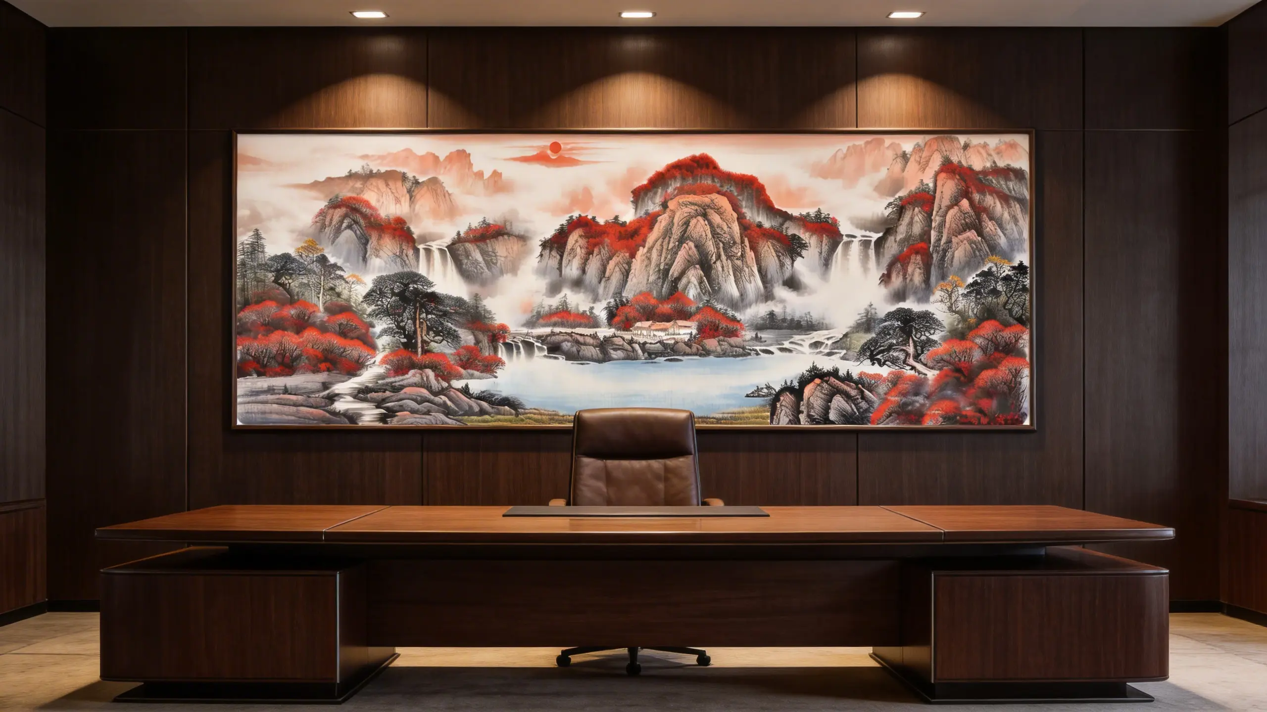 While other landscapes focus on the flow of water, this masterpiece focuses on the Gathering. Observe the geography: the surrounding mountains form a protective “U” shape, cradling the central lake. This creates a powerful energy container.